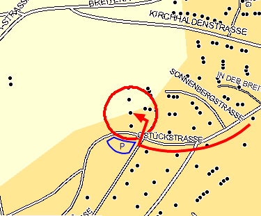 ... nach dem restaurant loewen rechts in die hoernlistrasse (beachte strassenschild bei spiegel) einbiegen. dann, leicht rechts, in die gstueckstrasse abbiegen ...