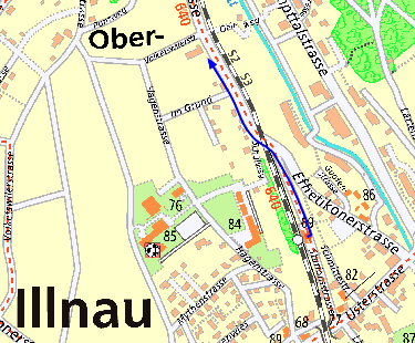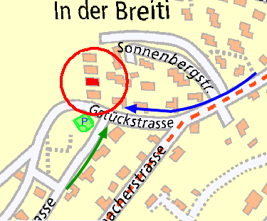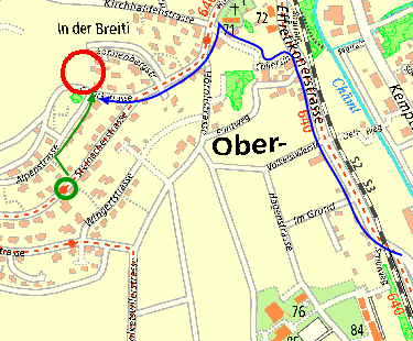 nach ca. 300m folgt man links dem chilerain bergaufwaerts. dann, bei der kirche, der hoernlistrasse entlang hochgehen und der gstueckstrasse bis zum ende folgen.